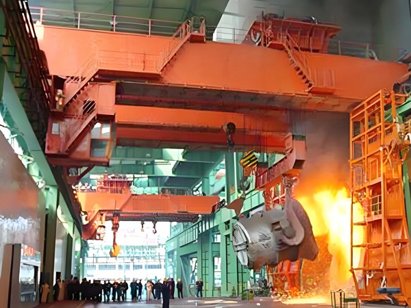 針對冶金行業(yè)高溫、多粉塵環(huán)境設(shè)計,起重量大(50-300 噸),關(guān)鍵部件(電機、電纜)耐高溫,配備隔熱裝置,用于吊運鋼水包、鋼坯等。